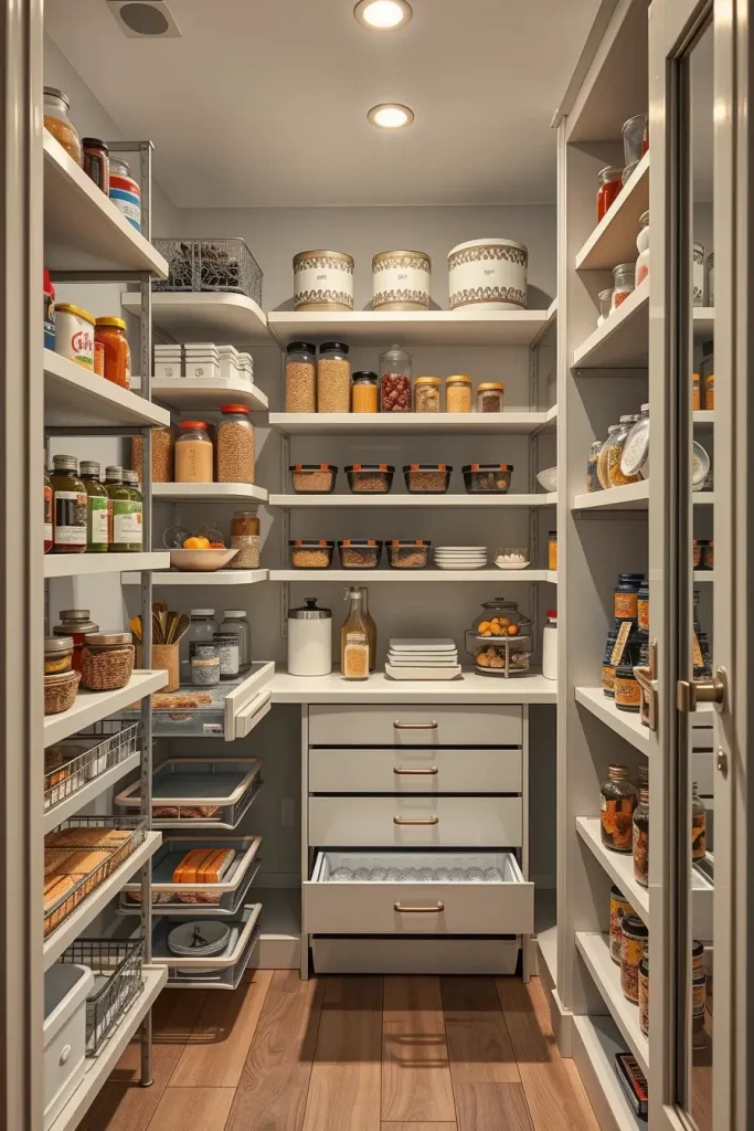 I use level shelves, drawers on wheels, sliding trays, and risers to build an internal structure that is well organized. The visibility of these pieces is maximized and helps the pantry to look bigger than it is. Tiered systems are also very efficient when dealing with canned goods or small jars due to the fact that labels remain completely exposed.