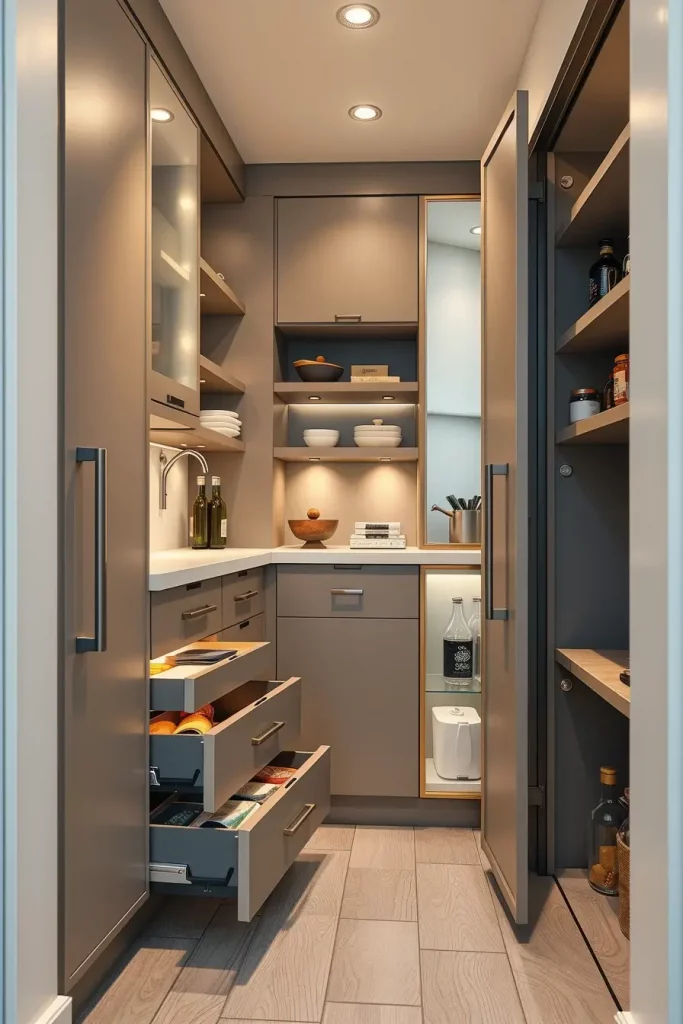 When creating small pantries with drawers and other compartments that are secret, I focus on the desired functionality and a smooth surface with no clutter. Visual organization is very vital in small areas, and that is why I use the hidden storage to ensure that the pantry appears disorganized. They can be hidden drawers where the most common items may be stored and vertical organizing where the items could be stored behind the doors of the cabinets that can create a smooth layout and make the cabinets look elegant.