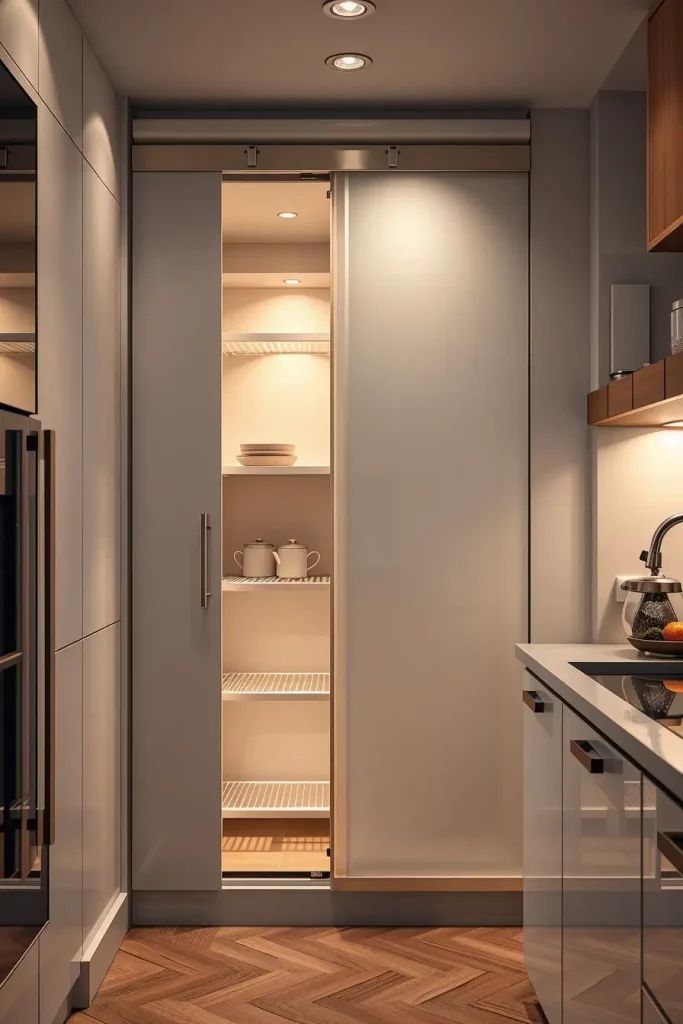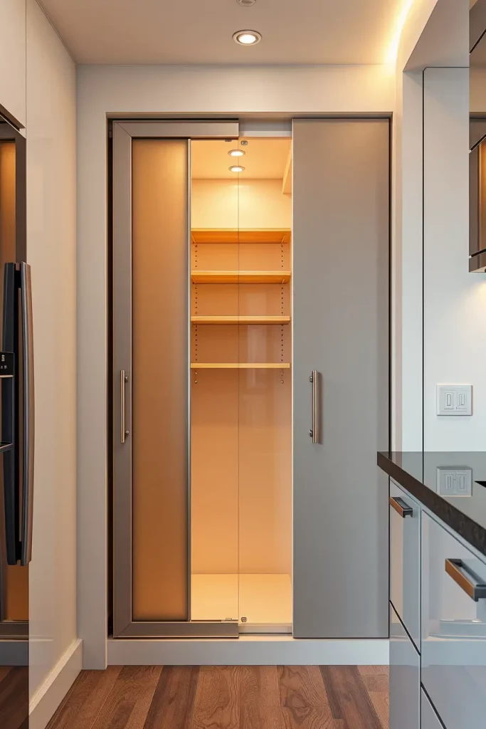 Sliding doors are also among my design favorites on ultra-compact pantries since they do not require clearance on the door swing. These doors in 2026 will have clean modern finish such as frosted glass, matte panels, or thin wood slats to give them modern appearance without compromising on space. The opening of the pantry at a lateral direction means that even in narrow corridors or the galley kitchen design, the homeowner is able to access the pantry.