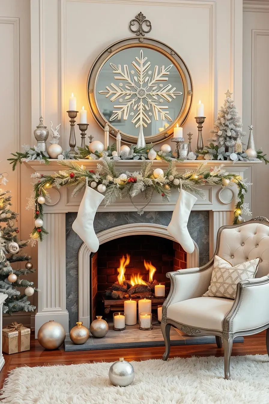I believe that this arrangement is dreamy and it is one of my favorite holiday decoration concepts. According to many interior designers it is advisable to add metallics such as silver during winter themes and I find it gives the design a lift and by no means crowded. To finish this appearance, I would have snowflake-colored wall art on top of the mantel.