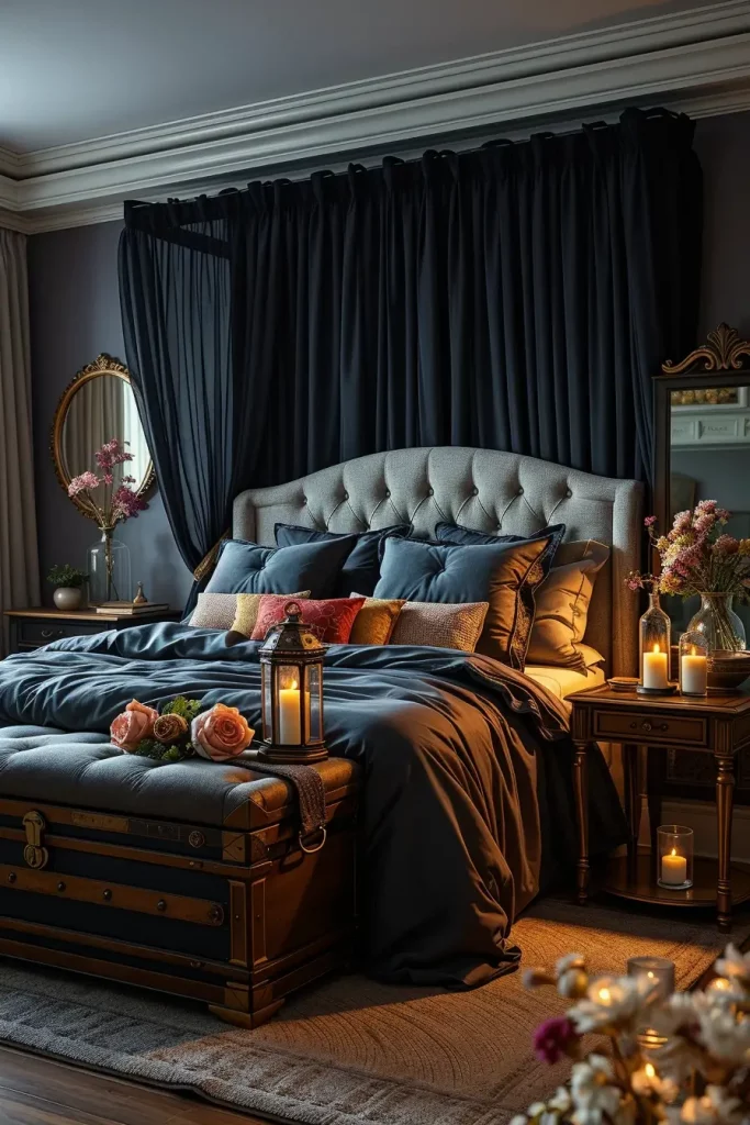 The furniture stays practical: an upholstered headboard (great for comfort and acoustics), dark-stained nightstands, and a vintage trunk at the foot of the bed for storage and scene-setting. I decorate small cloches with dried flowers, old books, and brass candlesticks with flameless tapers on the top. A long mirror with a distressed frame is leaning nearby to reflect candlelight to add depth.
