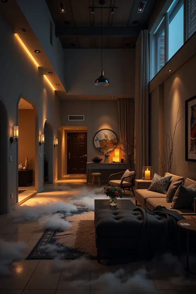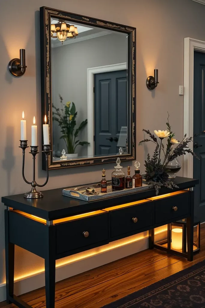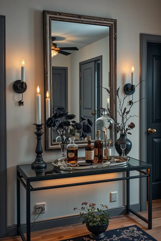 Item by item, I include a narrow black console with an antique silver tray of skeleton keys, apothecary bottles, and one cloche with dried blackened florals. There is a tall distressed mirror with candlelight and a motion-activated diffuser that emits cedar, clove, and smoke scents when the door is opened. I hang a narrow runner (dark, washable), swap standard lampshades for pleated black ones, and run a nearly invisible LED strip under the console edge for an ethereal glow.