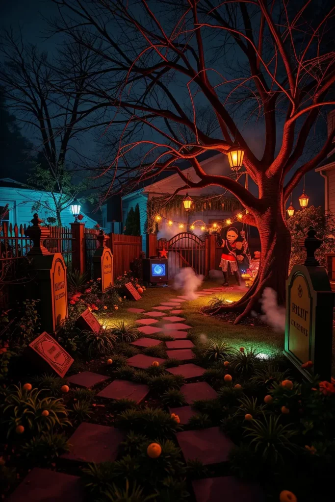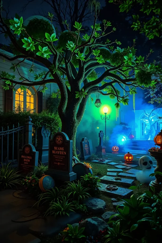 I sculpt areas in the yard: a theatrical approach, a centerpiece graveyard, and a single moving surprise, preferably animatronics with sound and movement. To keep the design coherent (and budget-friendly), I stick to two or three dominant light colors (warm amber, moonlight blue, toxic green) and build layers using LED spotlights, lanterns, and rope lights tucked under shrubs.