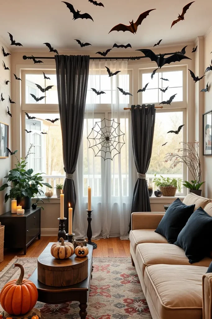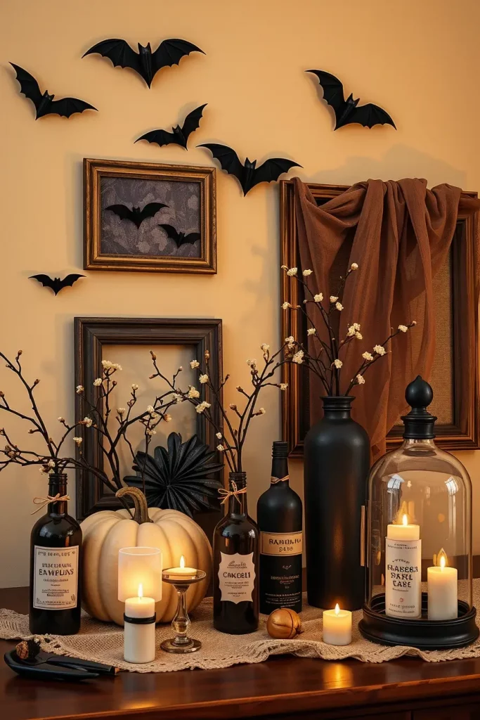 Matte-black peel-and-stick bats, removable spiderweb window clings, fabric tension-rod curtains in midnight velvet, flameless taper candles with remote dimmers, lightweight gauze over lampshades, and collapsible cardboard or foam-core tombstones to place in entry corners, item by item, I reach. A slim black runner over a console, a bowl of black sand with bone-handled cocktail stirrers, and monochrome pumpkins (spray-painted with water-based, easily strippable paint on paper tape) round out the vignette.