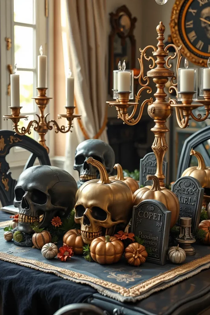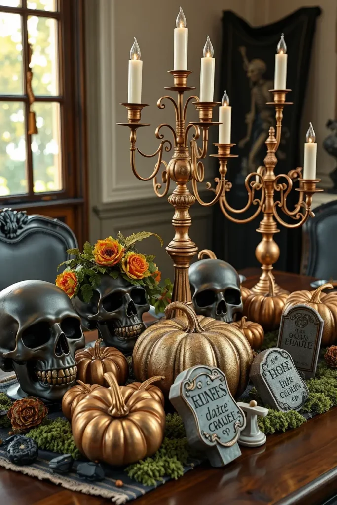 I love a Dollar Tree challenge: it is all about paint, scale, and grouping. To decorate the house with Halloween home decor ideas 2025, I take plastic skulls, foam pumpkins, thin candlesticks, glass vases, and fake flowers, and then I unify them with matte-black or stone-effect spray paint. All of a sudden, it is editorial, not bargain bin.