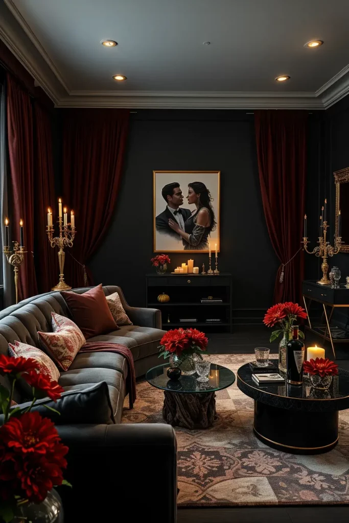 I will define a low, curved velvet sofa in charcoal, a marble or onyx-topped cocktail table, smoked acrylic bar cart, black tulle or voile drapery and antique brass candelabras with dripless black tapers. On the walls, I might hang temporary gothic-framed digital art (e-ink or digital frames) that loops archival horror illustrations. I will also include weighted velvet table runners, bone-china coupe glasses and hurricane vases with deep burgundy dahlias to maintain the palette and keep it upscale.