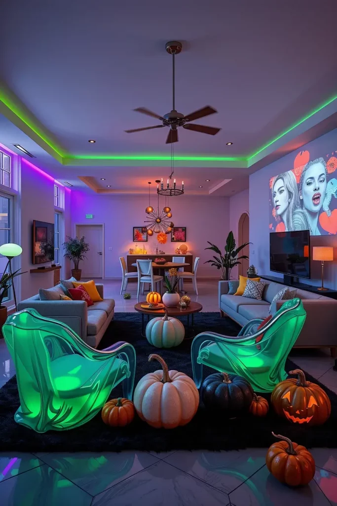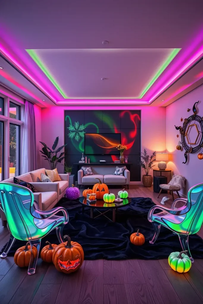 I add modular LED tube lights, color-changable smart bulbs, neon-acrylic coasters, lacquer trays, glossy painted pumpkins in ombr e gradients, and acrylic ghost chairs that allow light to pass through. The space is anchored by a black area rug, and three-neon triad is repeated by throw pillows and blankets to create consistency. An interior RGB lit matte black bar cabinet is an instant show piece.