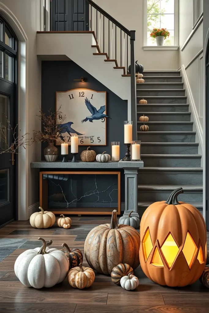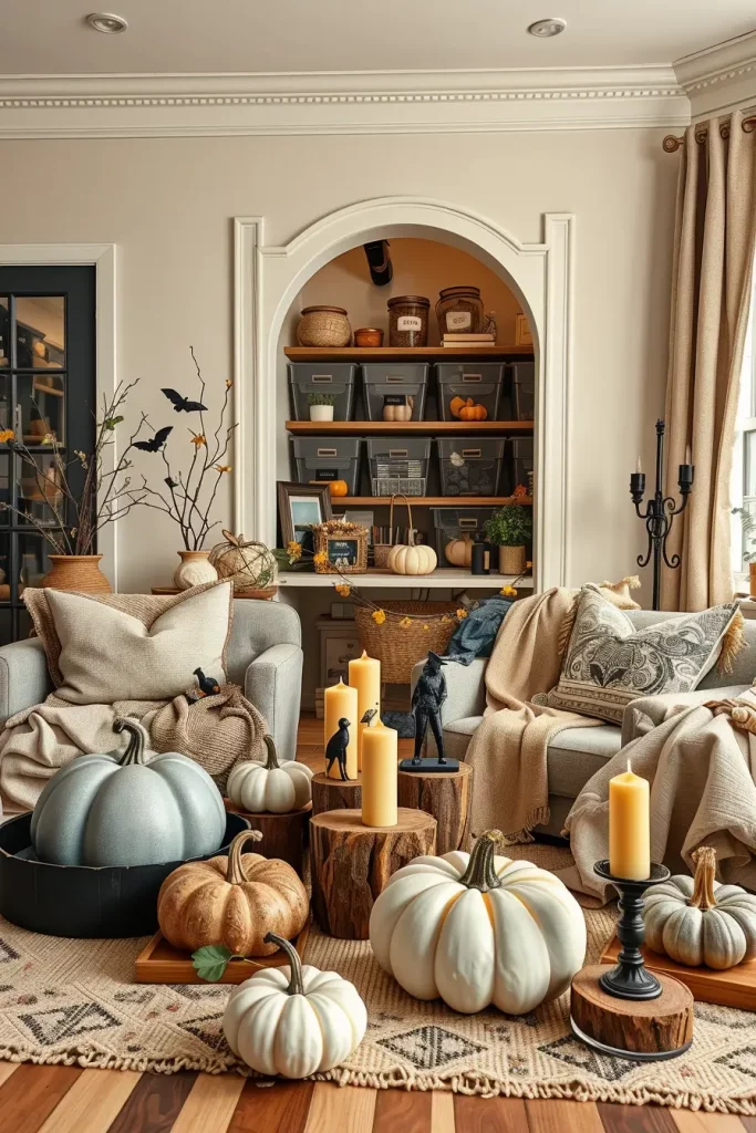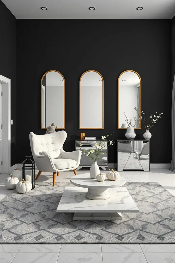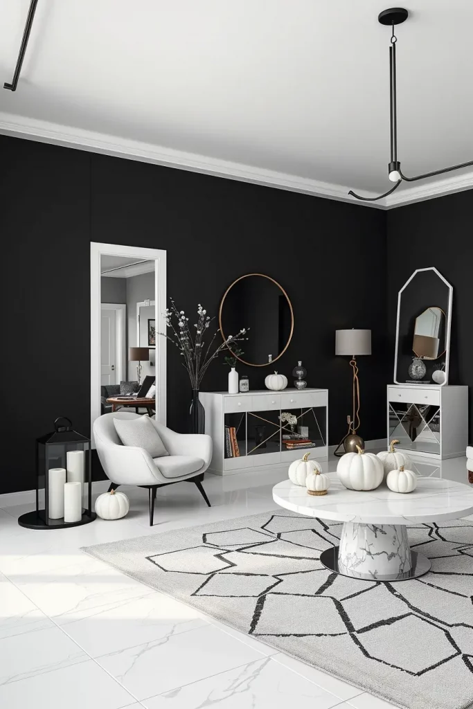 To clients who despise visual clutter, I create a black-and-white Halloween that is sculptural, graphic and serene. I use silhouette shapes, high contrast wall decals and negative space. This is where the fans of minimalism can still enjoy Halloween home decor without ruining their style. I’ll paint (or cover) one accent wall in deep black and layer white matte ceramic pumpkins, bone-white taper candles, and thin-line black metal lanterns.