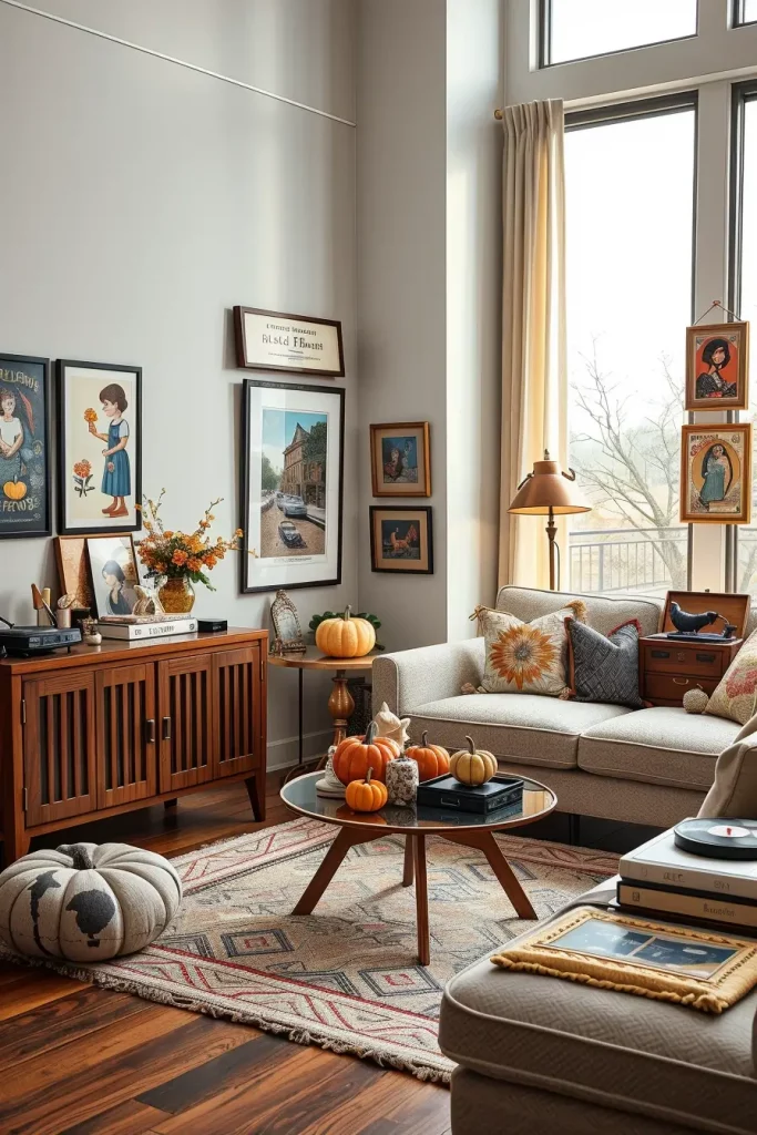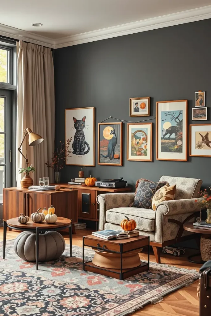I will mix a walnut credenza, a boucle or channel-tufted sofa, a brass pharmacy floor lamp, and a patterned wool rug with selected retro items: papier-mache pumpkins, tin noise-makers, early-1900s postcard prints in thin black frames, and Bakelite-inspired orange trays. The retro angle is subtly supported by a record player playing creepy old time jazz or theremin music.