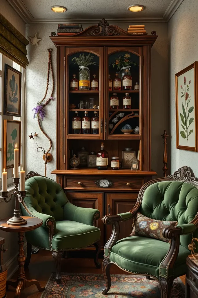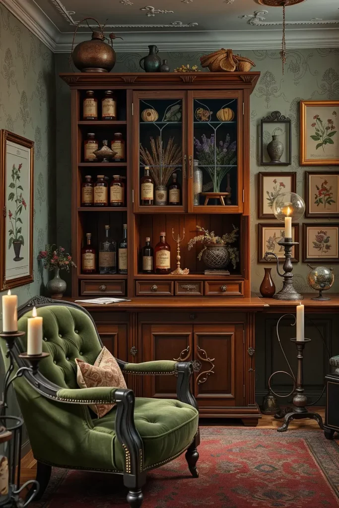 I am precise about a glass-door apothecary cabinet, marble mortar and pestles, brass balance scales, black taper candles in iron holders, ethically sourced crystals on walnut shelves, and linen-covered vintage books. The vibe is finished off with a mossy green velvet chair in front of a small reading table and an oil diffuser with vetiver or cedar. It is intimate with low warm lighting.