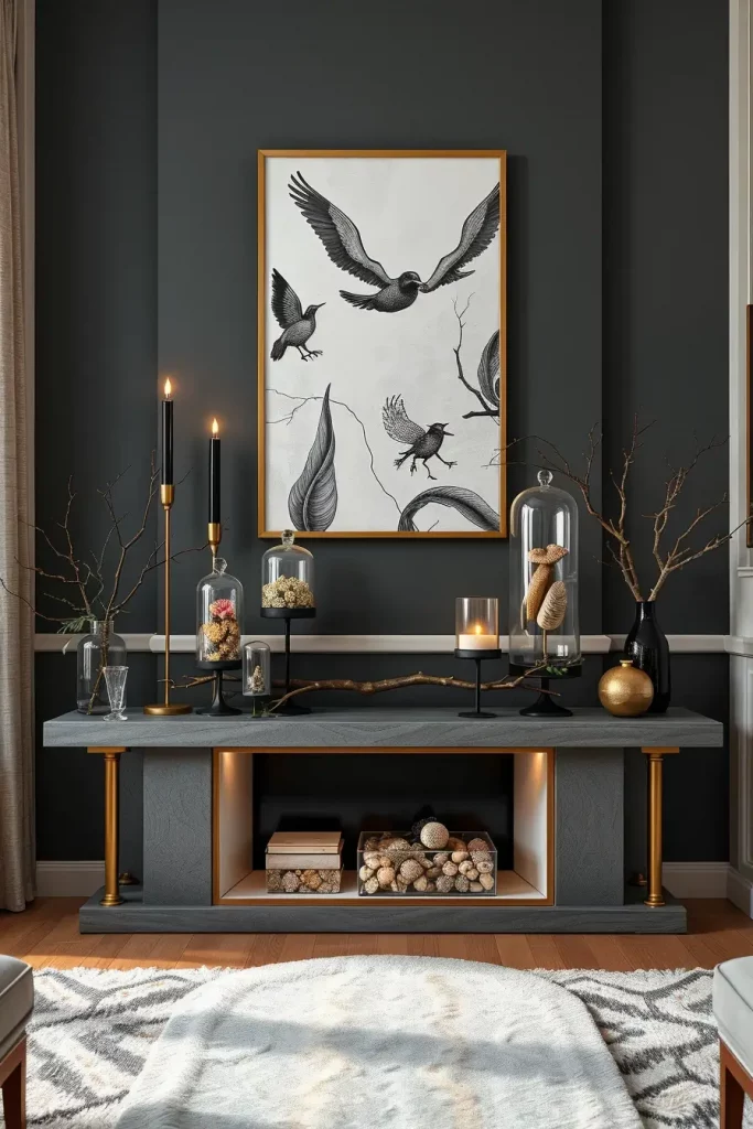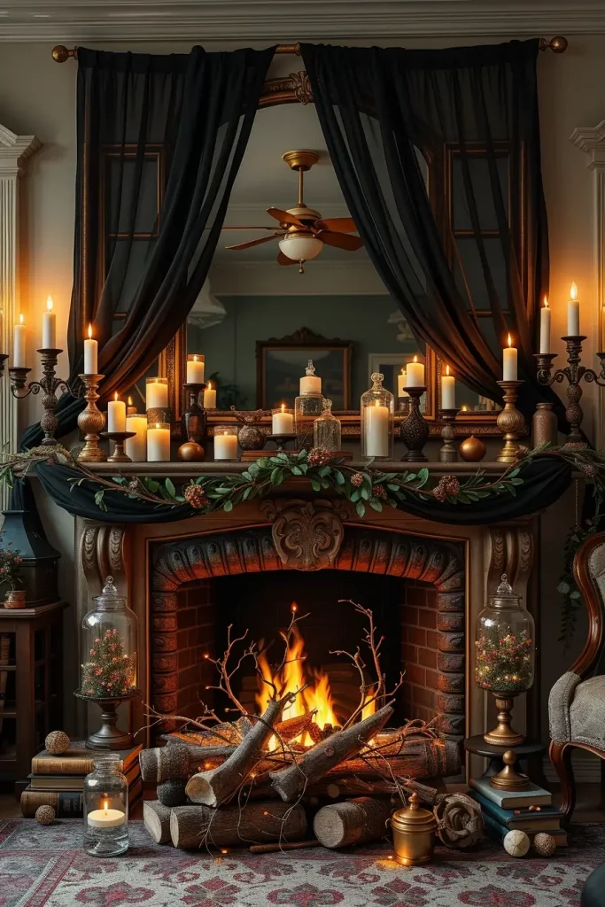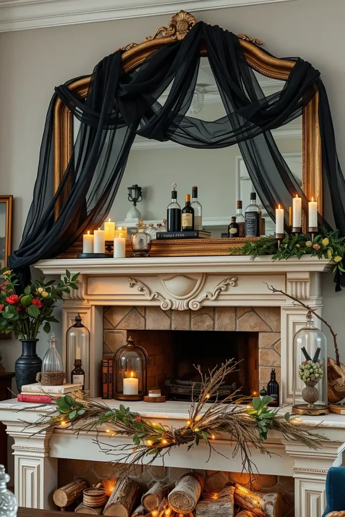 When I style a mantel, I think in vertical layers: back (statement mirror or oversized antique frame), middle (stacked books, apothecary bottles), and front (LED taper candles, cloches, mini skulls). The depth is achieved by the texture story matte, glass, aged metal and tattered fabric, but there is no visual noise. It is one of my favorite DIY playgrounds since minor replacements can change the atmosphere in a short period.