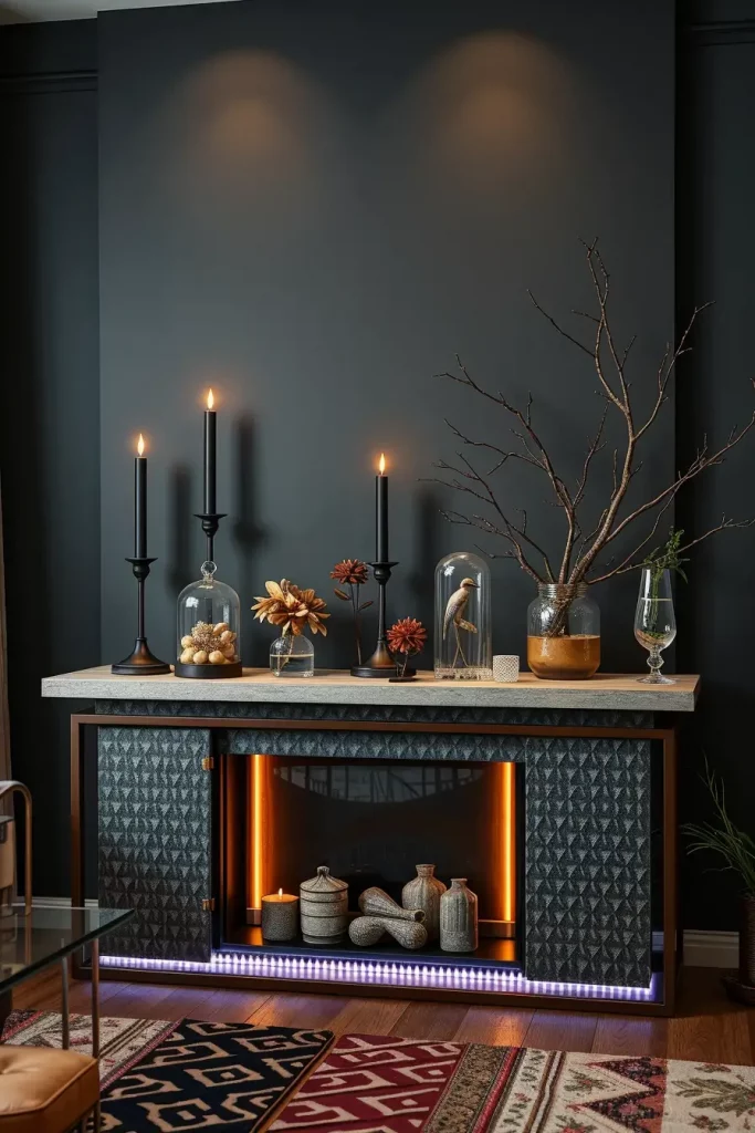 I specify black taper candles in mixed heights, cloches over tiny “specimens,” ceramic pumpkins in stone or concrete finishes (they feel modern and more sustainable than plastics), and a thin smart lighting LED strip tucked under the mantel lip to lift everything with a dim, programmable glow. I will use a velvet runner, bone-colored bead garlands, and a pile of occult-looking coffee-table books on a console to take the palette beyond orange-and-black basics.