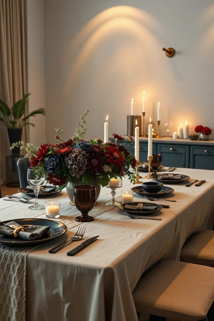 In 2025 I am going full moody deconstructed botanicals, dried blackened hydrangeas, burgundy dahlias, dusty eucalyptus, and trailing amaranthus, low and sprawling so that people can still see each other. I prefer a raw linen or black washed cotton tablecloth overlaid with frayed gauze runners, to give a contrast of texture. Candlelight? Always. I placed a grid of low votives with varying pillar heights so the general light is not blinding but warm.
