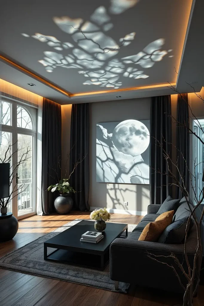 On the gear front, I rely on ultra-short-throw projectors to avoid complex installations, HomeKit or Matter-compatible bulbs/strips to control everything in one place, and motion sensors to set audio or lights to go off as people move around. I conceal projectors in black painted boxes or bookcases to preserve the look. This tech is all surrounded by very analog decor, matte black drapes, textural rugs, and sculptural branches, so the space does not feel like a tech demo.