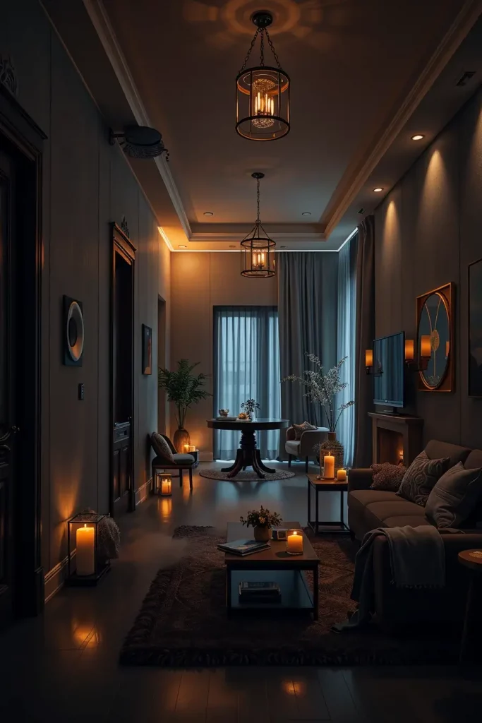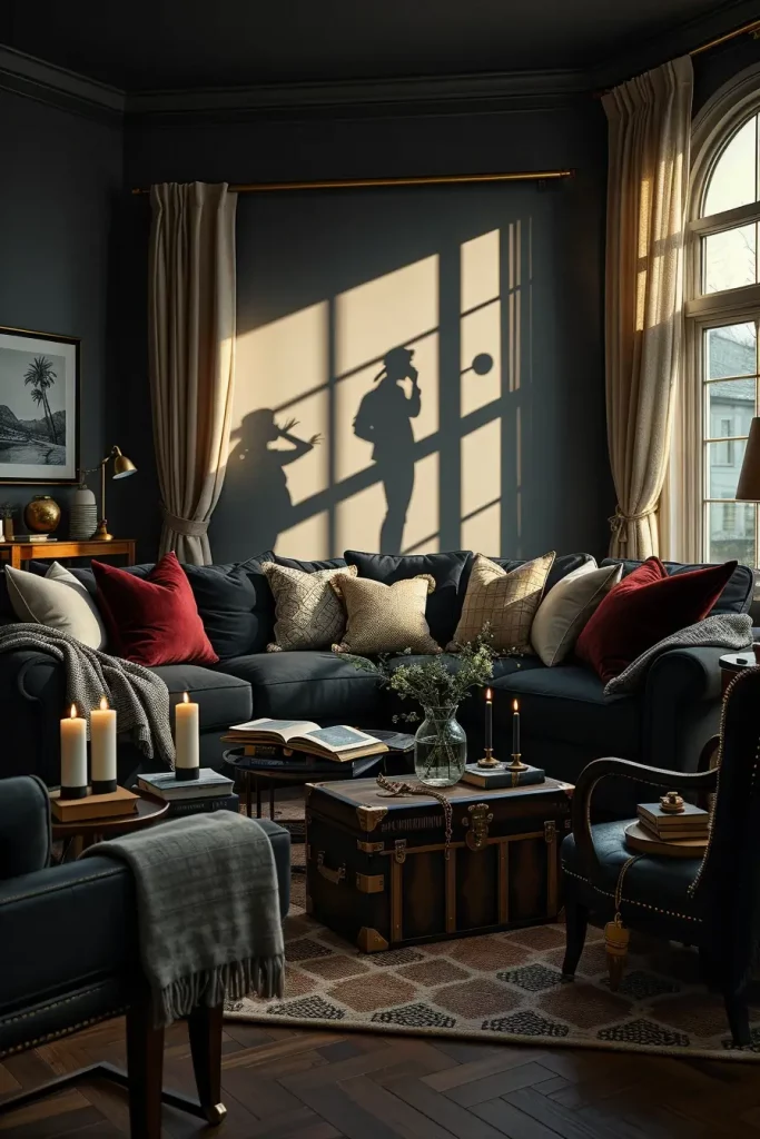Item by item, I bring in a black slipcovered sofa (washable = practical), chunky knit throws, velvet pillows in oxblood and slate, and a low vintage trunk as a coffee table for “Victorian curiosity cabinet” vibes. I pile matte-black taper candles, stacked antique books, and faux crow figurines on a brass tray; fasten lightweight cheesecloth on curtain rods to create a quick “cobweb voile” effect; and install a discreet projector to project slow-moving shadow silhouettes on the wall. Since I am fond of adjustable lighting, I scatter Wi-Fi LED puck lights in lanterns and under shelves to make floating lights.