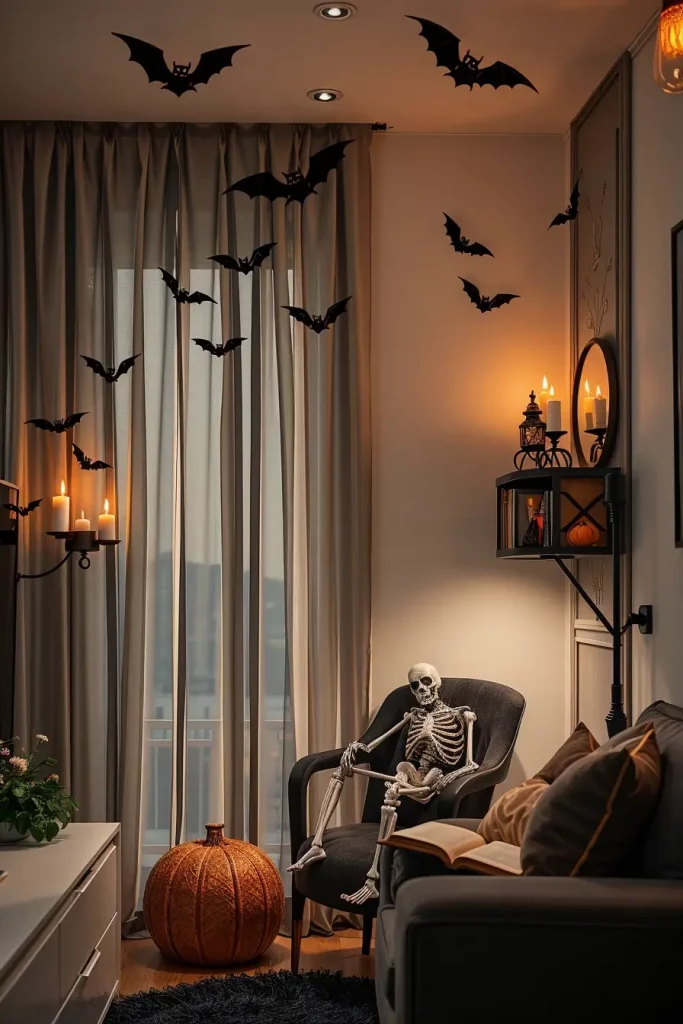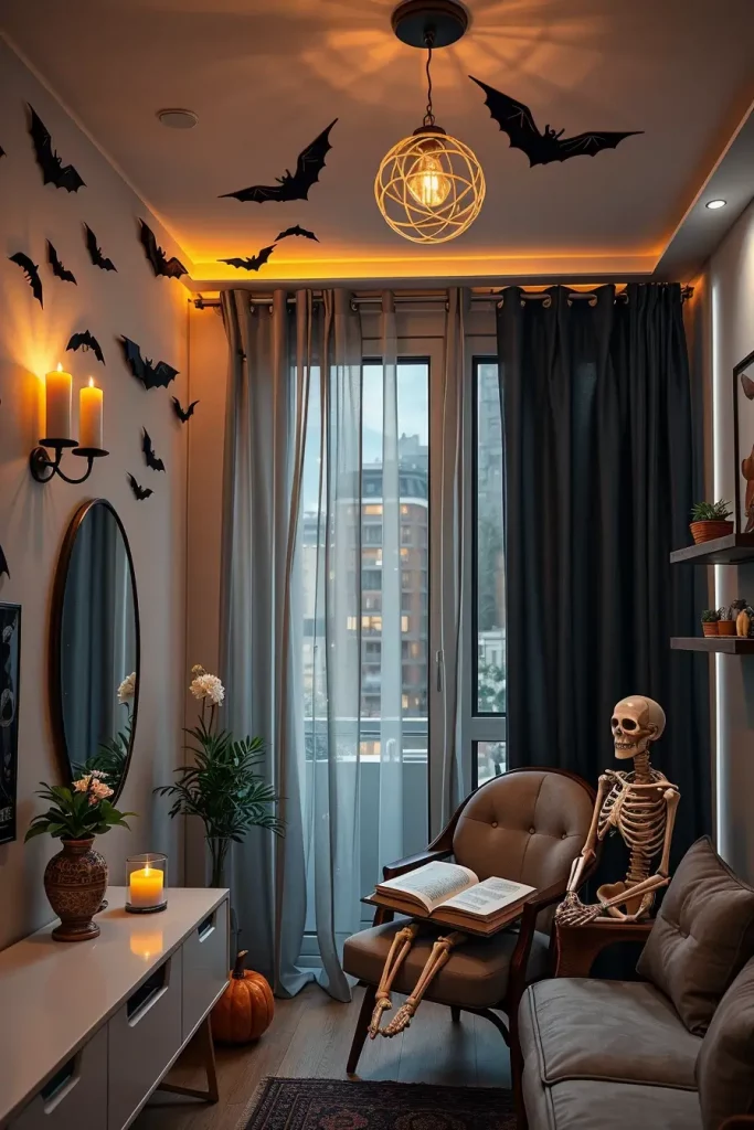 I rely on space-saving items like foldable black room dividers wrapped in faux vines or cheesecloth, magnetic bat decals that can be reused on any metal surface, and ultra-thin smart lighting strips (under furniture or along wall corners) to cast eerie uplight without visible cords. I will include a mirror or two to increase the visual space, and place props, such as a small skeleton in an armchair or a fake spellbook on a floating shelf, so that they lead the eye upwards.