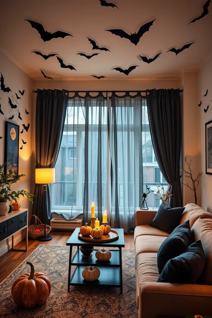 When living in a small apartment or even in a micro-space, Halloween decor must provide the most atmosphere with the least clutter. I use vertical surfaces, doors, mirrors, windows, so I do not waste valuable square footage. Some stick-on LED candles on shelves on the wall, some sheer black curtains with a backlight, and some hanging paper silhouettes of ravens or crescent moons can make it in a minute. I use the space as a stage: concentrate the energy on a single wall and leave the rest breathable.