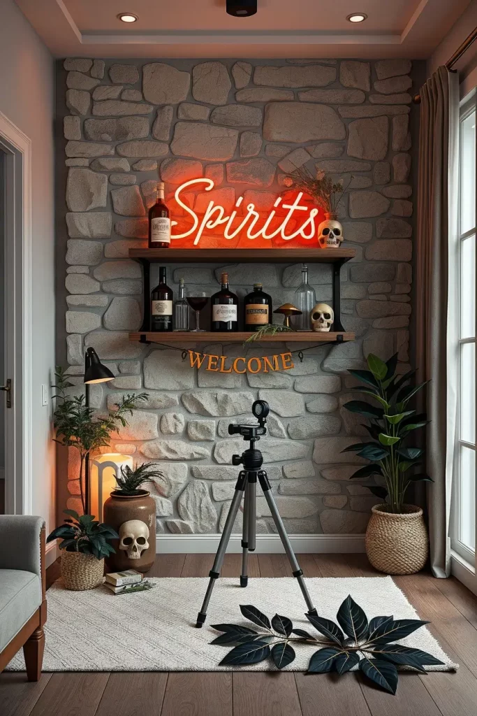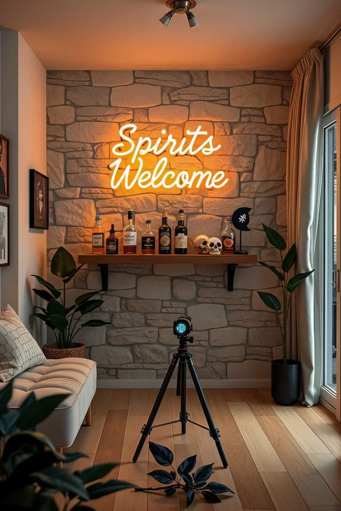 I build it with a peel‑and‑stick backdrop (glossy black tile effect or moody faux stone), a floating ledge for curated props (vintage apothecary bottles, matte skulls, moon mirrors), an LED neon sign (e.g., “Spirits Welcome”), and a floor scatter of black faux leaves. The floor markers in the form of tripods guarantee that your phone will always get the same flattering angle. I also add a custom hashtag branded lightbox or acrylic prop.