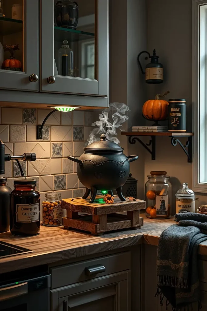 At home, I am more functional in the kitchen: the areas have to be cookable, but it does not imply that it cannot resemble a witch lab. I group styling to corners and open shelves, and prep area is free. My anchor: a diminutive LED smoking cauldron atop a wooden riser, flanked by labeled brown apothecary jars, creepy specimen cloches and faux herbs hanging on iron hooks.