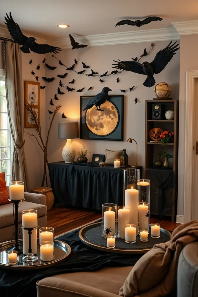 To update in 2025, I reduce these icons to graphic shadows, tone-on-tone textures, and high-end finishes. Imagine matte-black ceramic cats, brass crescent moons, and jet-black feathered crows on acrylic stands, no kitsch, all contour. I will make walls neutral and drive the drama with high contrast lighting and sculptural placement.