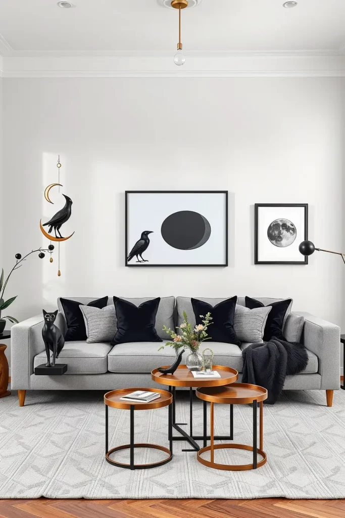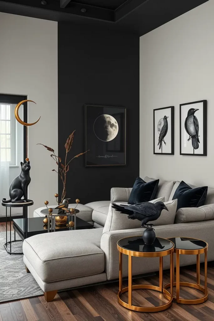 I design sculptural crescent floor lamps, black and white lunar phase art in narrow black frames, and a selected set of midnight velvet cushions on a neutral modular sofa. A trio of black-and-gold nesting side tables are stacked and used as candle and obsidian stone altars. Crows perch on top of modern books (“Supernatural Minimalism,” anyone?) to keep the vignette witty, not childish.