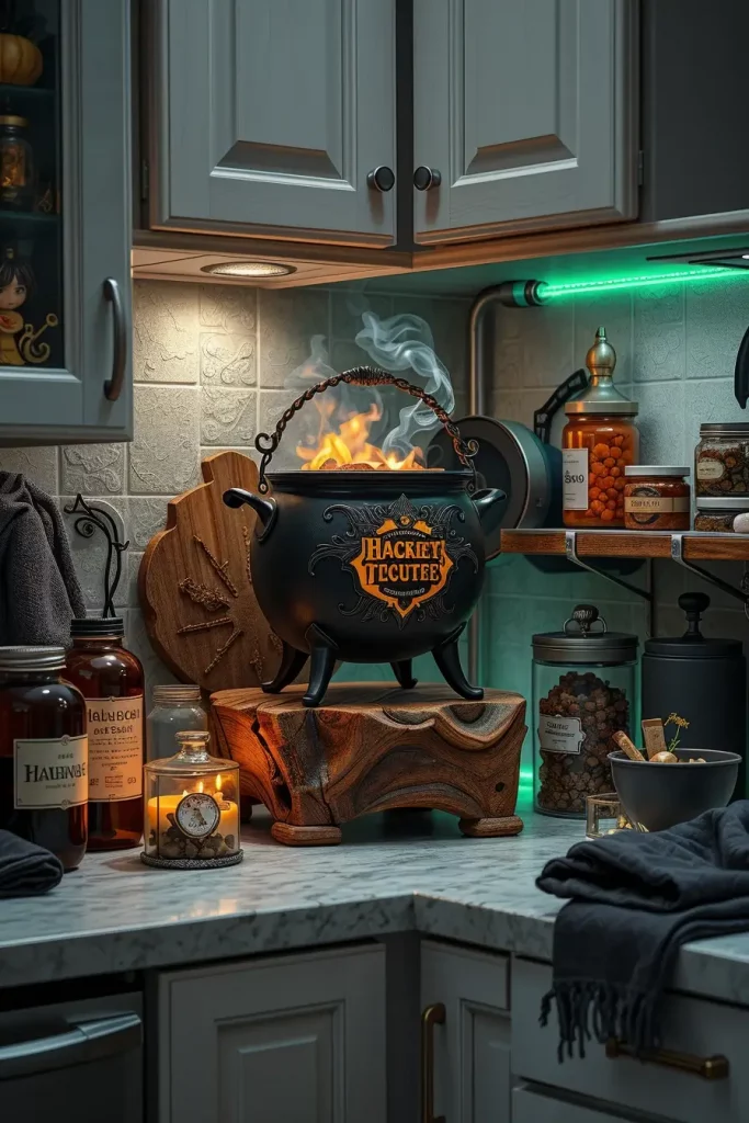 To get even more, I would include projection boiling effects on the backsplash or a mini digital frame that cycles animated potion recipes- fun, theme-appropriate and easily turned off after October.