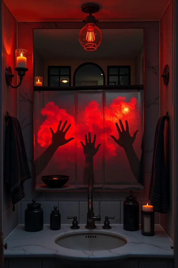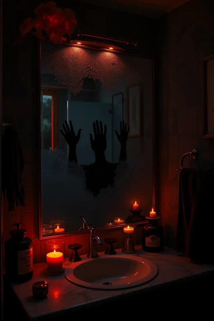 Bathrooms are ideal locations of jump-scare technology since they are small and reflective. I start with dim, LED-strip backlighting behind the mirror, a motion sensor that triggers a low red glow, and a discreet ultrasonic fogger inside the vanity (vented through a cracked drawer) for short spurts of mist. The rest is restraint: monochrome towels, matte-black pump bottles, and a single eerie floral (like black eucalyptus) in a slim vase.