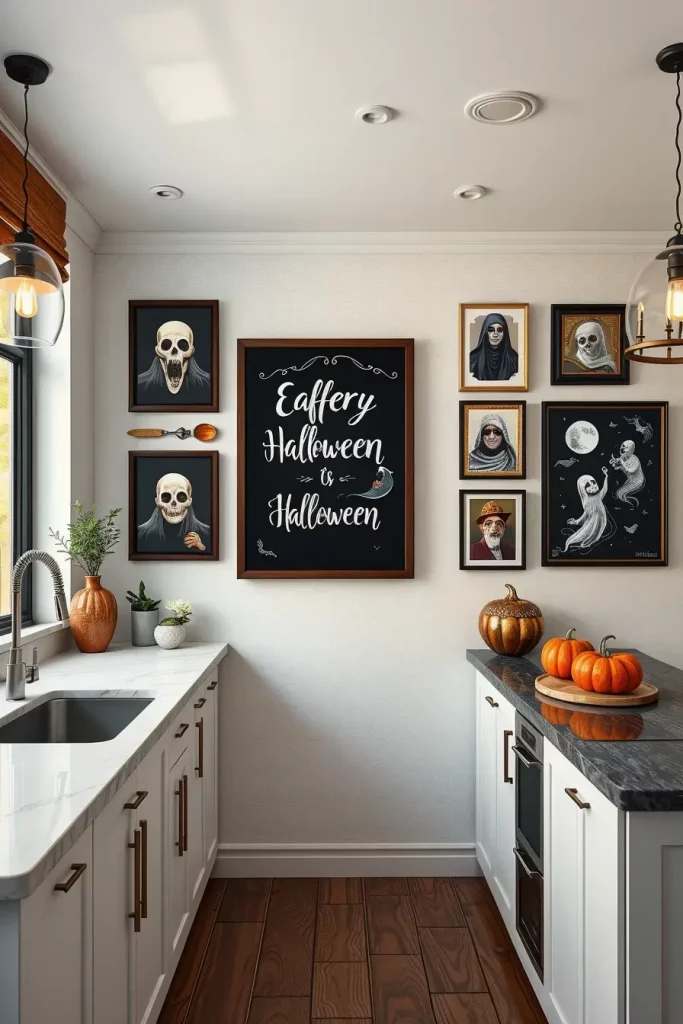I place three black-and-white prints in frames above the coffee station, and I write spooky quotes or Halloween menus on chalkboard paint. Old vintage-style photos that have been manipulated to appear ghostly are also used as gallery walls and they create a chilling effect. Printable art is an affordable means of changing images as the holiday draws near.