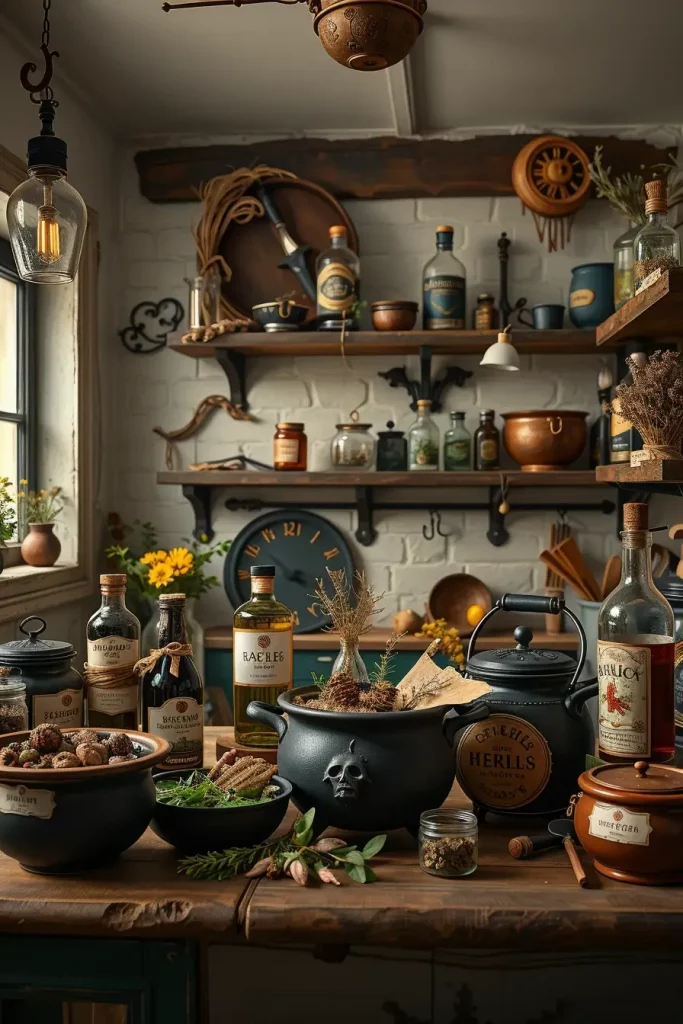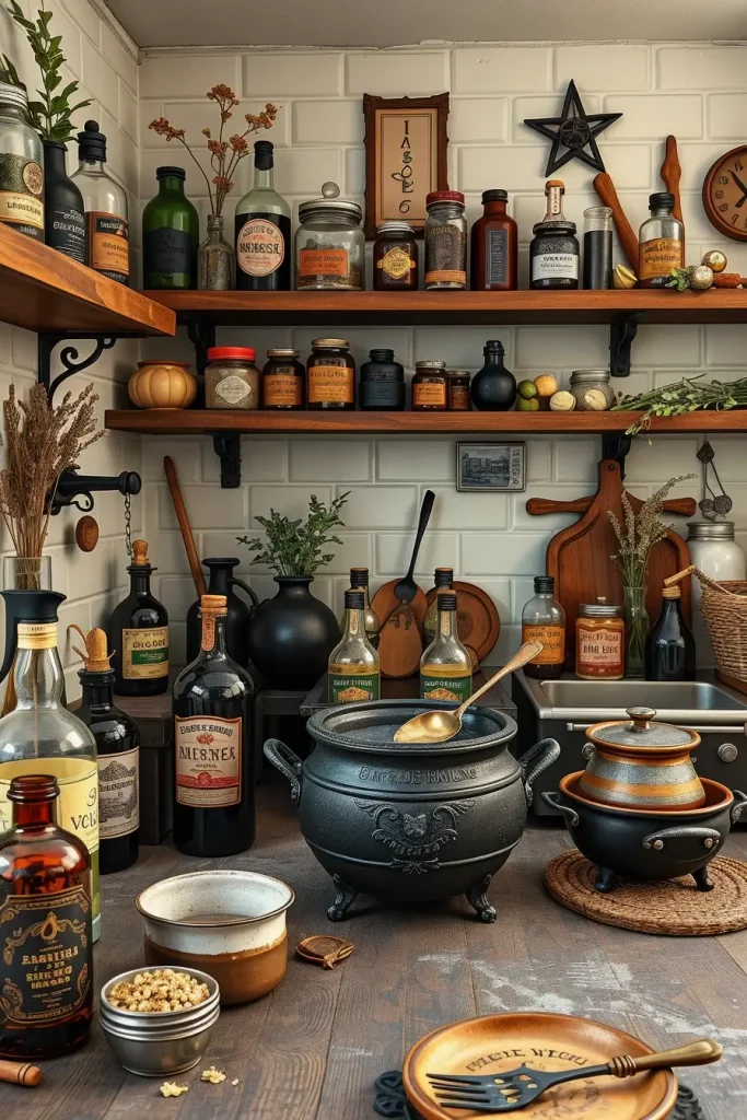 You can make your kitchen look like a magical apothecary by adding witchy decor. I adore using cauldron shaped cookware, potion bottles labeled with chalk, and fake herbs to give it a magical feel. These objects can be both ornamental and functional when they are arranged in the right way.