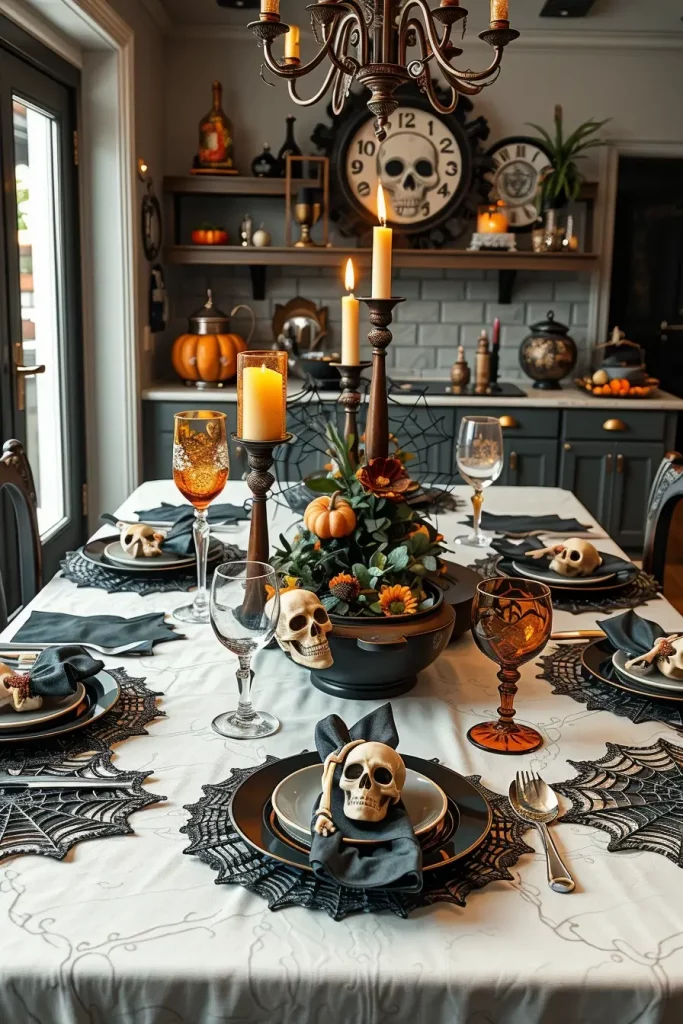 I serve on matte black dishes, skeleton-hand napkin rings, and spiderweb placemats. The bold centerpiece is a pumpkin casserole dish or a skull-shaped soup tureen. Amber or black colored glass goblets make it luxurious. I also use themed place cards or small scroll menus tied with black ribbon to make it personal.