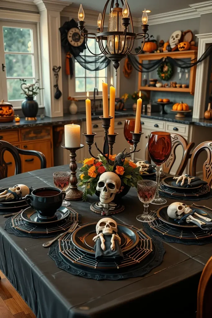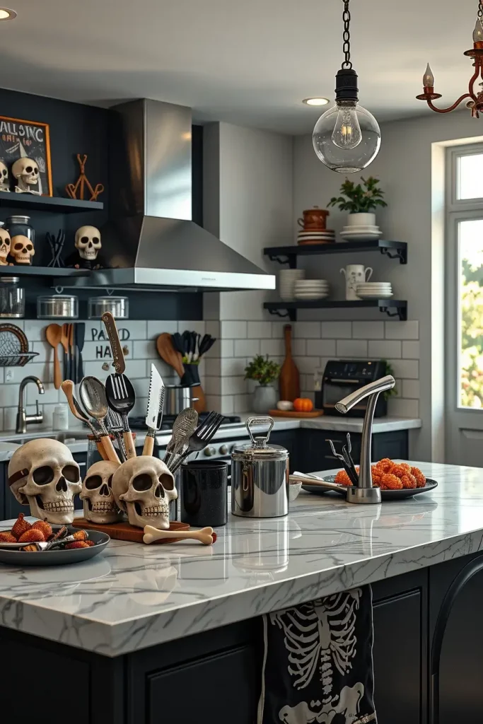 Personally, the decoration of skeletons is most likely to impress the visitors and maintain the general atmosphere. According to Better Homes & Gardens, even the tiniest kitchen accessories can have an enormous thematic effect. I have found this to be true-my skull tongs are always complimented at Halloween parties.