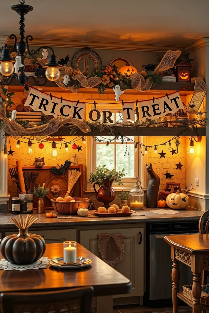 I typically use banners with messages like “Trick or Treat” or “Boo!” in glittery lettering, mixed with garlands made from felt bats, skulls, or tiny ghosts. The burlap and lace combination is adorable and orange and black pom-poms are whimsical. You can even do them yourself with your own color scheme and message.