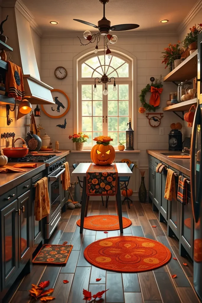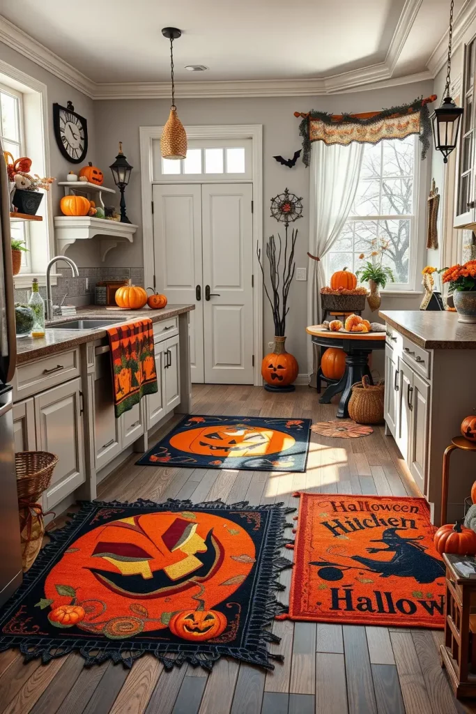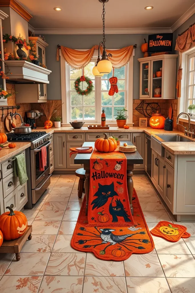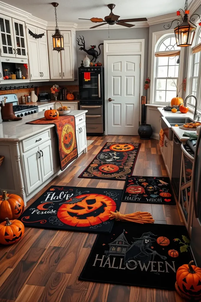 I have a soft runner with orange jack-o-lanterns and cobwebs on the borders in my kitchen along the island. I had a memory-foam mat in front of the sink with a phrase, Witchs Kitchen and ghostly imagery. These are not just ornamental rugs but they also aid in alleviating fatigue during long hours of cooking.