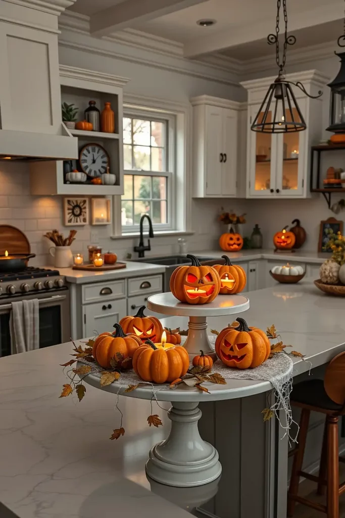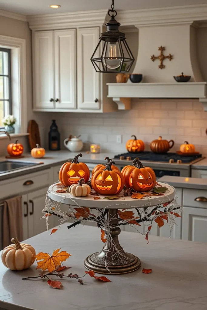 Mini jack-o-lanterns are a cute and functional way to get into the Halloween spirit in a small kitchen or for a minimalist decorator. I place them at windowsills, counter tops or even on cake stands to have them in layers. The battery-powered ones are safer and more adaptable to kitchen settings.