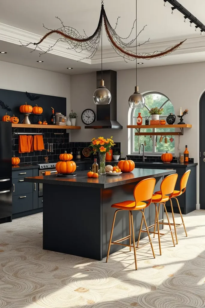I would recommend matte black cutlery, orange dish cloths and a Halloween table runner. Pumpkin-shaped acrylic containers with candy or oranges and black cauldron-shaped bowls are whimsical but not cluttered. The color scheme can be made more immersive with a checkered backsplash or orange LED lights under the cabinets.