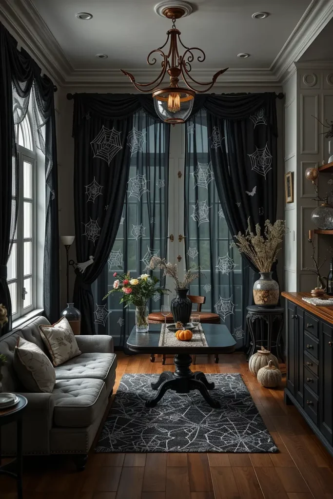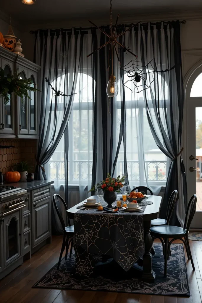 I added sheer black curtains with silver web on the kitchen window. My kitchen rug had a soft-touch spider web pattern, which could be washed by machine, which was very convenient as a kitchen. I completed the decor with a black and gray webbed runner on the island and dish towels to match.