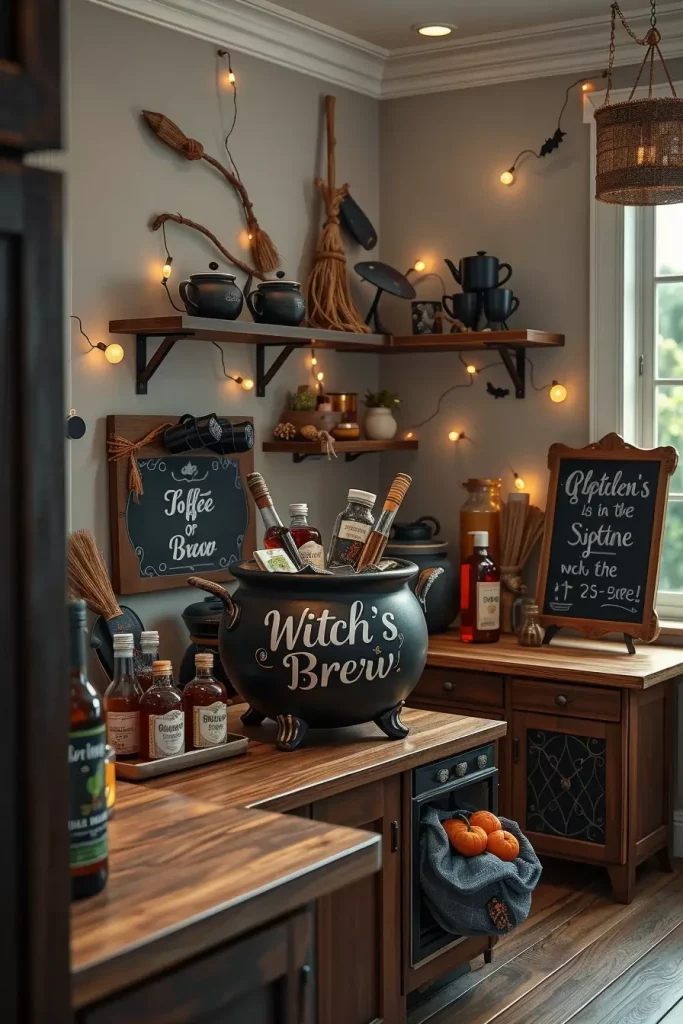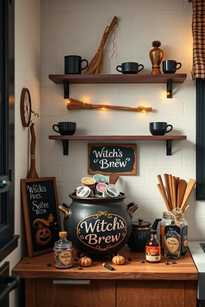 I put a big ceramic cauldron with coffee pods beside my espresso machine. There was a chalkboard sign that leaned against the wall that read Witchs Brew and I used labeled potion bottles to hold syrups and stirrers. There were black mugs with dripping patterns on floating shelves that had small brooms and LED tea lights.