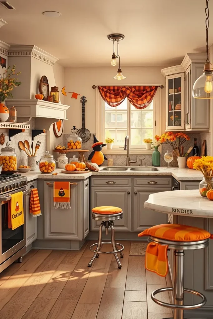 Candy corn-themed decoration adds a cozy feeling and nostalgia to the kitchen and provides a bright color scheme of orange, yellow, and white. In 2025, this iconic treat is being used by designers to push color schemes on linens, storage, and accessories.