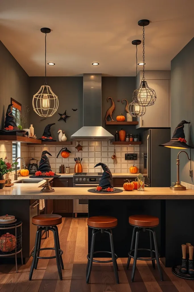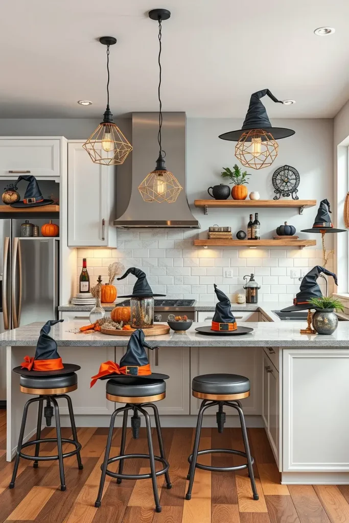 Witch hat ornaments are whimsical, magical, and scream Halloween, but not so spooky. By 2025, the witch hats are being used creatively by homeowners who place them on bar stools, corners of cabinets, and even pendant lights.