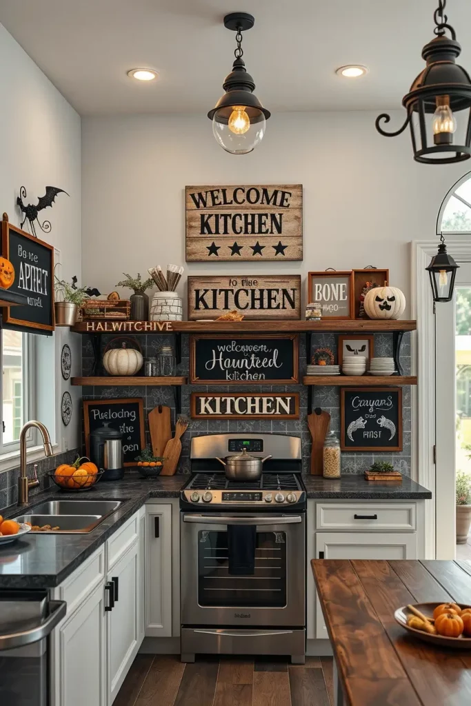 Halloween-themed signs are one of the simplest and most effective Halloween decorations that you can use in your kitchen. These signs can be humorous, spooky, or even pun-filled, depending on the atmosphere you’re trying to create. In 2025, rustic materials and clever typography are the new trend, and a lot of homeowners are embracing the farmhouse-style chalkboards or metallic wall plaques with funny phrases.
