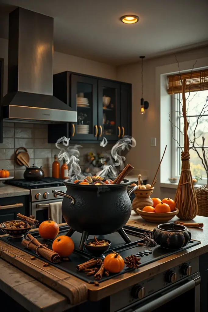 The scented decor is usually not considered when it comes to Halloween kitchen design, but it is crucial to create the atmosphere. By 2025, simmer pots are a trendy and practical option to fill the kitchen with the aroma of autumn and spookiness. A pot of simmering orange peels, cloves, cinnamon sticks, and a sprig of rosemary on the stove in a black cast iron pot gives a warm cozy feeling.