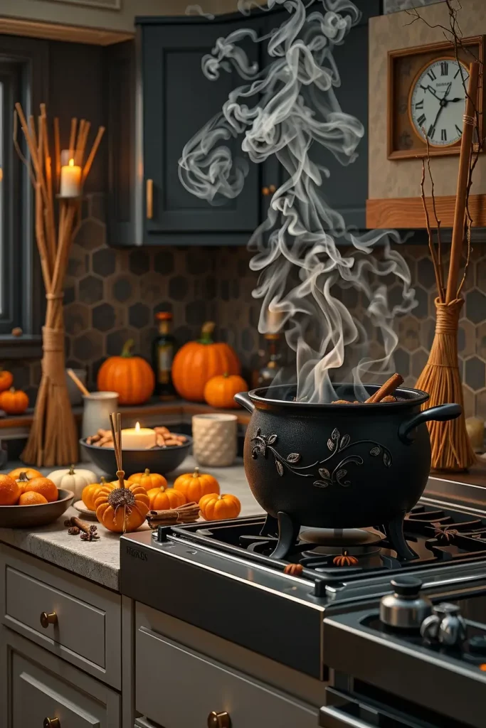 To finish this look, I’d suggest a smoke machine hidden behind the kitchen island or dry ice in a safe cauldron bowl to create that magical, smoky feel—just be sure it’s safely ventilated.