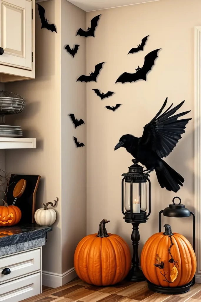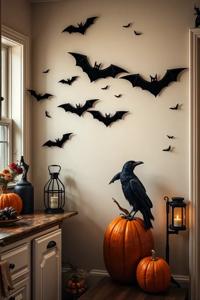 Bat and raven decor is best suited in small corners of the kitchen that are usually not used. These animals introduce the traditional gothic Halloween atmosphere without overloading the area. In 2025, designers are suggesting sculptural wall bats and realistic bird models to introduce creepy beauty to the awkward areas.