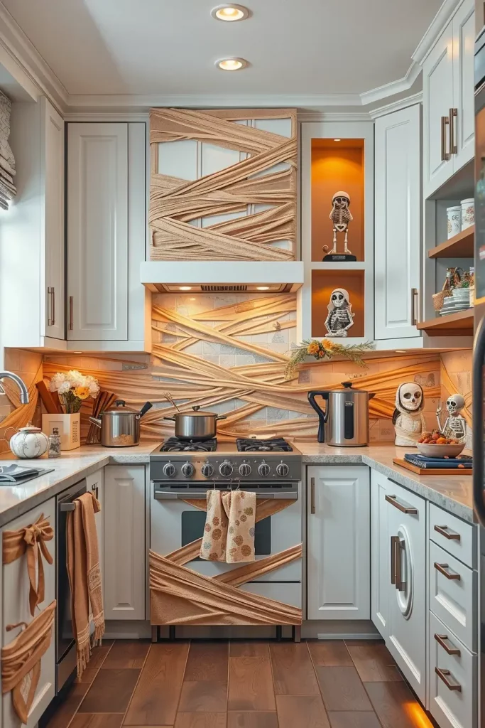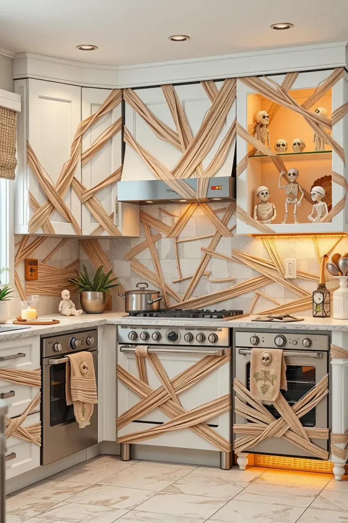 It has turned out that a mummy-style solution is surprisingly effective with contemporary kitchens that have smooth or minimal bottom designs. The style is based on the idea of bandaged textures and neutral colors, so it is a rather inconspicuous but creepy choice of decor in your Halloween kitchen. It is especially good in white or off-white kitchens, where the details can be noticed without conflicting.
