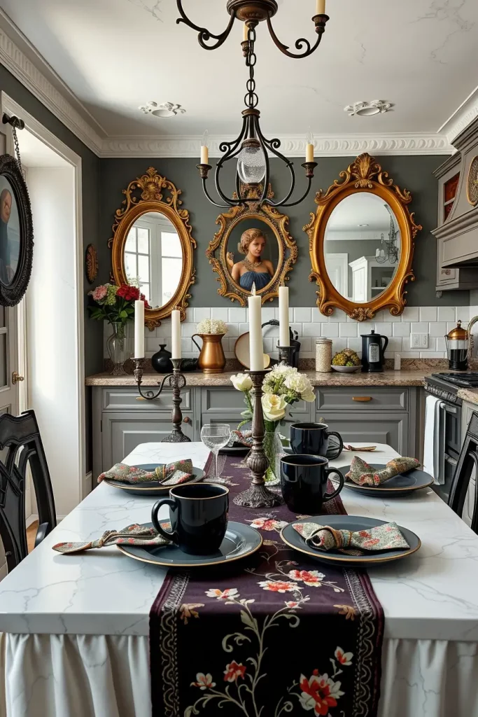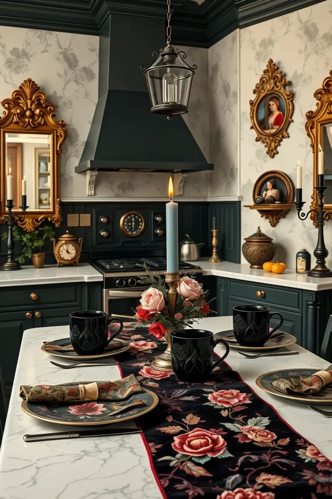 I add dark floral napkins, crystal decanters with creepy labels and black ceramic mugs with fancy handles. Raven statues, fancy mirrors, and wrought iron wall hooks to hang utensils are excellent additions. The overall gothic effect can also be achieved with the help of velvet table runners and dark lace curtains.