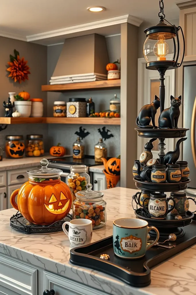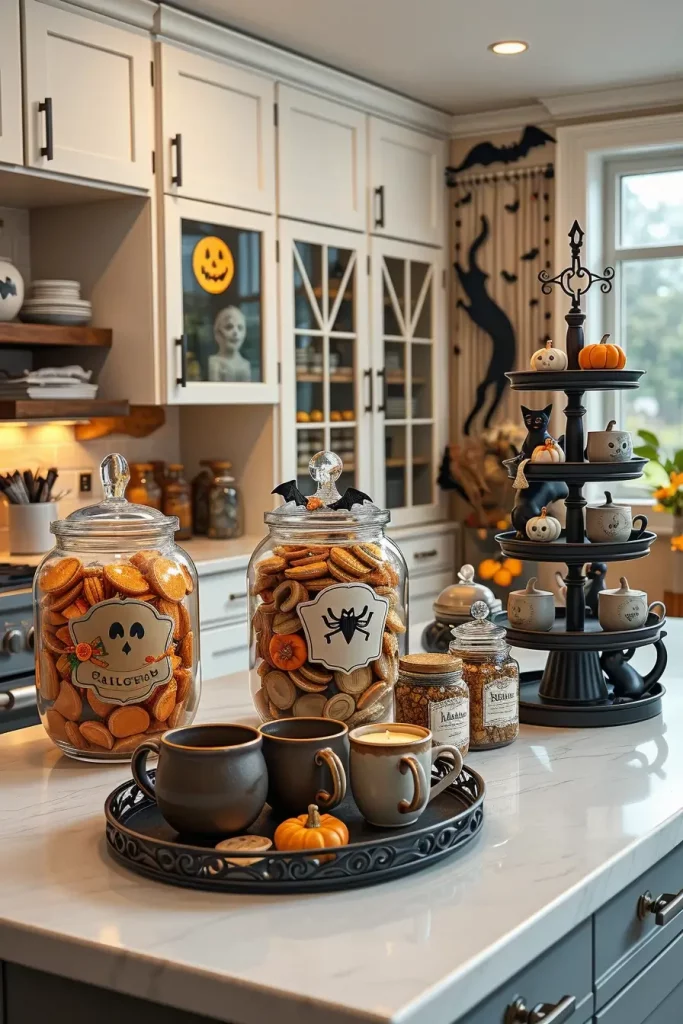 To enhance this appearance even more, you can make a tiered display next to your coffee maker or snack bar, with mini pumpkins and some spooky figurines.
