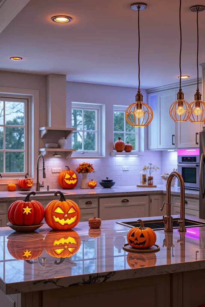 Begin with the soft-glow LED pumpkins on the windowsills or on the top of the cabinets. I would recommend warm amber or flickering white to look like the actual candlelight. The haunted tone can be achieved with under-cabinet LED strips that change colors, particularly orange, purple, or green. Pendant lights can have smart bulbs that can be programmed to change color automatically on Halloween night.