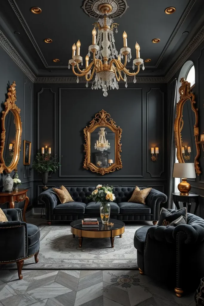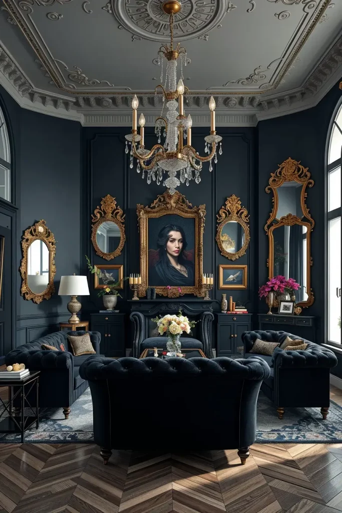 Gothic living room decor is getting a new face this year with the modern glamour. I have discovered that people who own homes desire drama without clutter, and they want to use luxurious materials such as velvet, crystal, and deep matte blacks to add depth to the room. Muted charcoal walls look fabulous with dark wood or black floors and arched windows or high ceilings make a perfect backdrop to this intense style. It is about making a bold mood that is rich, sophisticated, and a bit mysterious, which is great for Halloween.