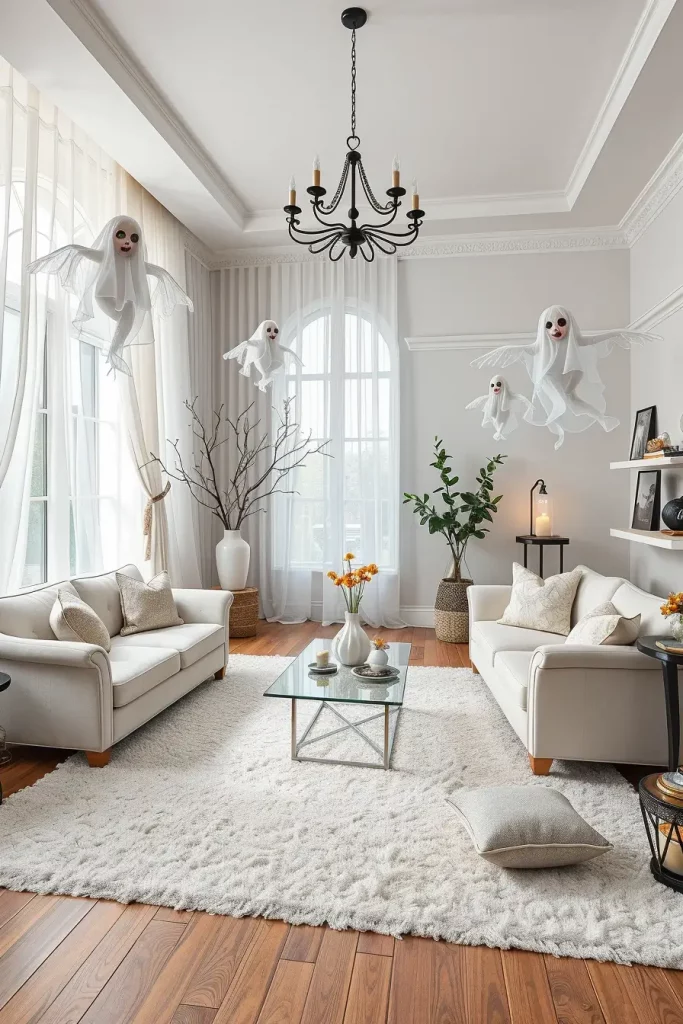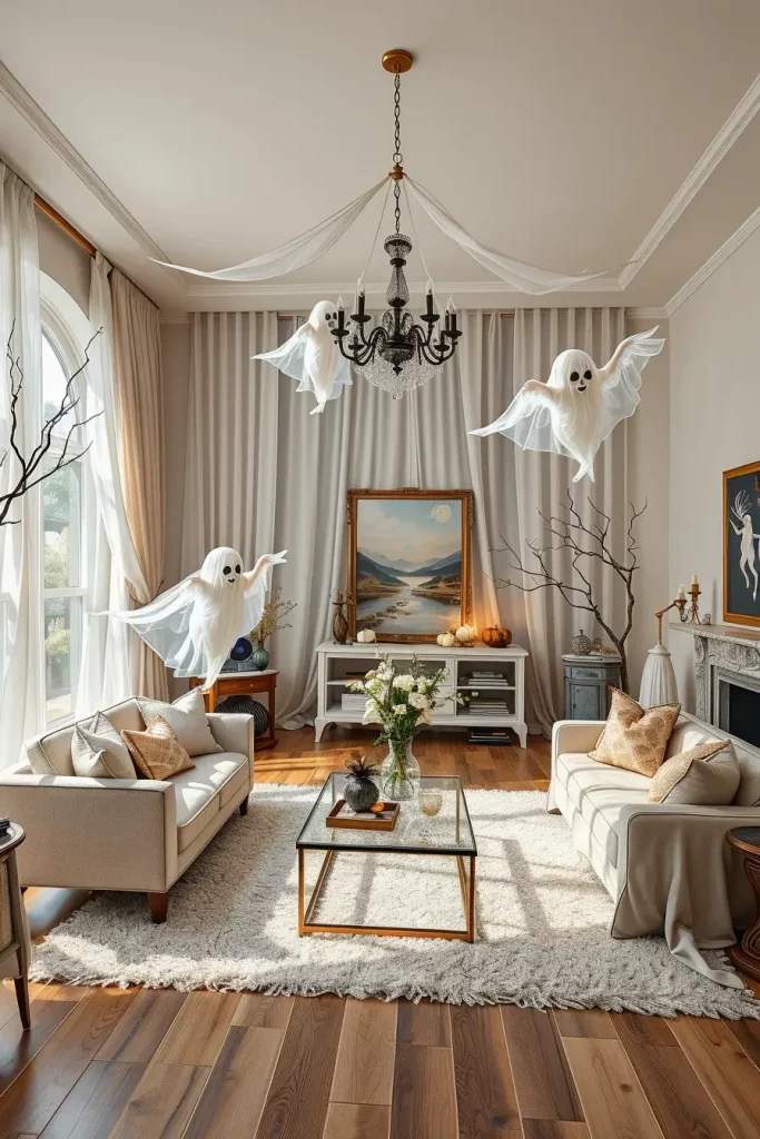 In 2025, floating ghosts are back, and now they are more fashionable than ever. I prefer to hang sheer white or gray tulle on ceiling hooks or light fixtures to give the effect of floating spirits. They bring a whimsical drama without taking up your space. It is a great idea to incorporate your ceiling space into your Halloween living room.