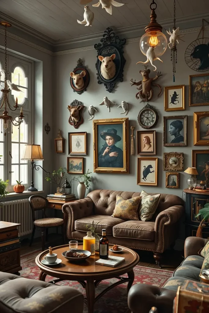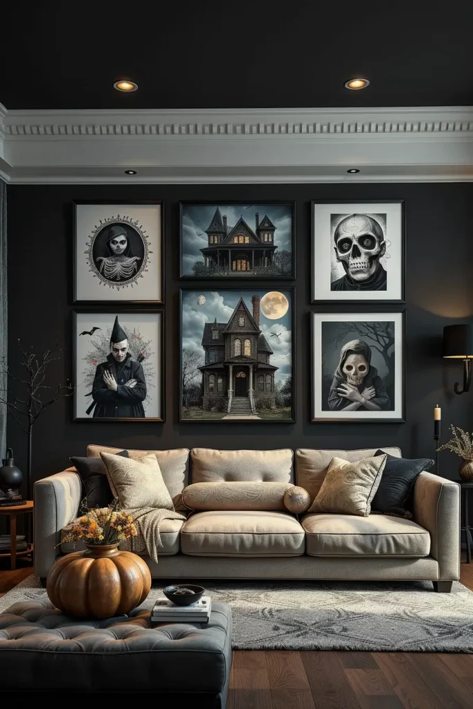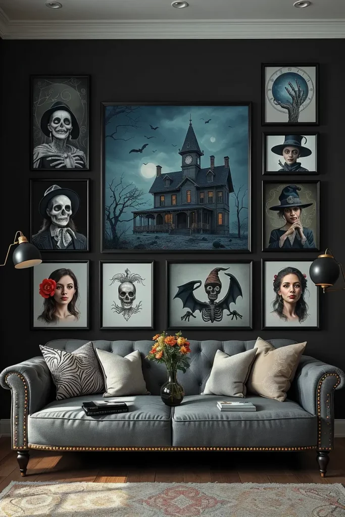 I would mix and match framed pieces of different sizes, shapes, and tones, matte black, burnished bronze, or even antique silver. Shadow boxes with dried autumn leaves or wall hangings in three dimensions are added. I will usually add vintage frames, creepy portraits, or mirror decals that reflect creepy lighting in an artistic manner. Even a minimalist line art can have a haunted look when it is matched with an appropriate color scheme.